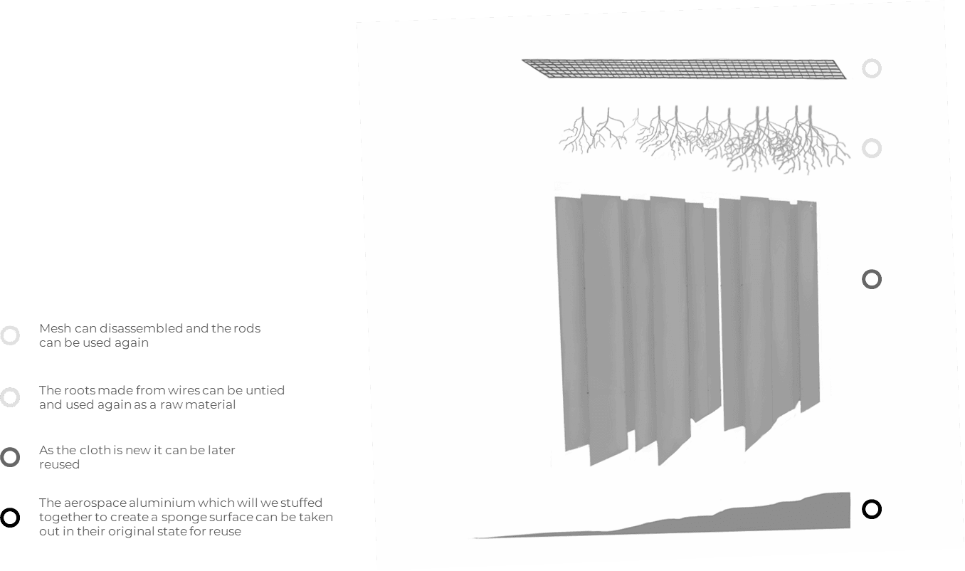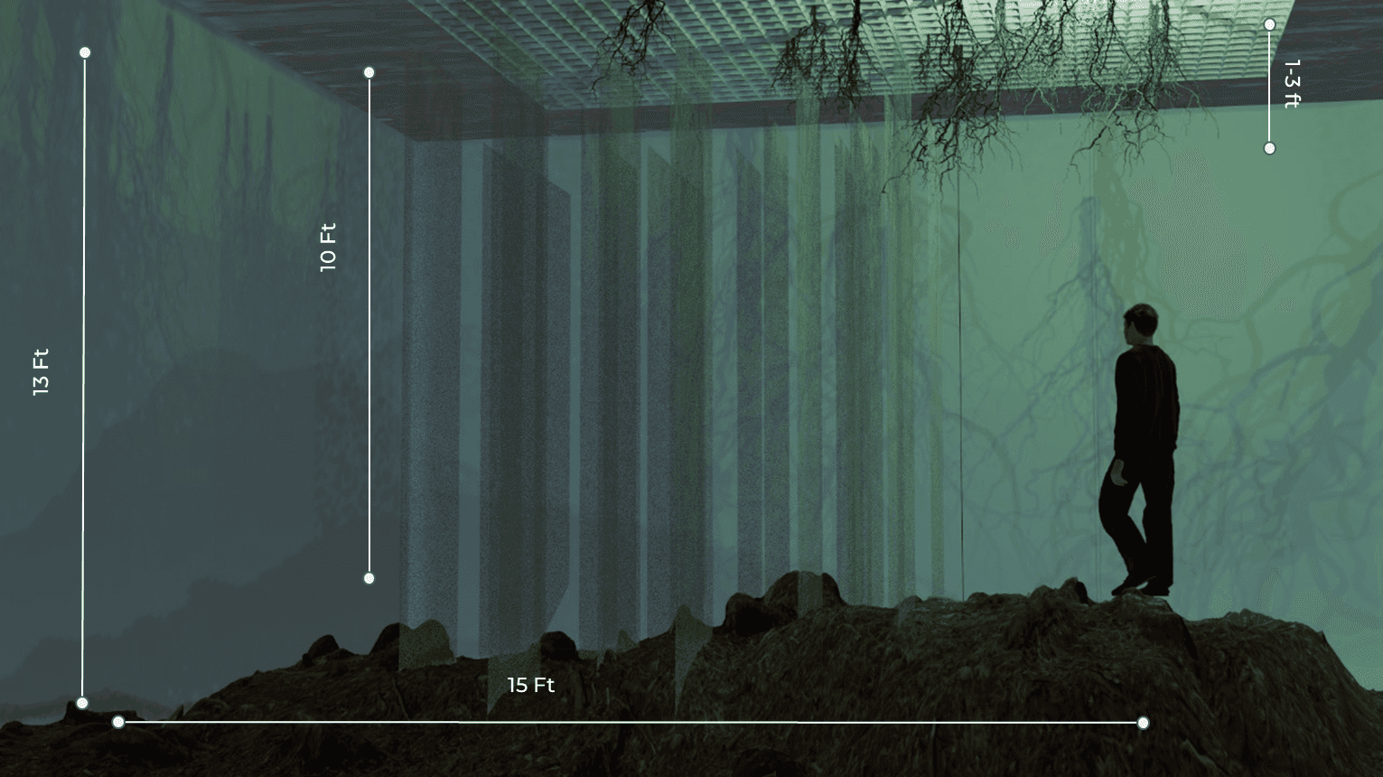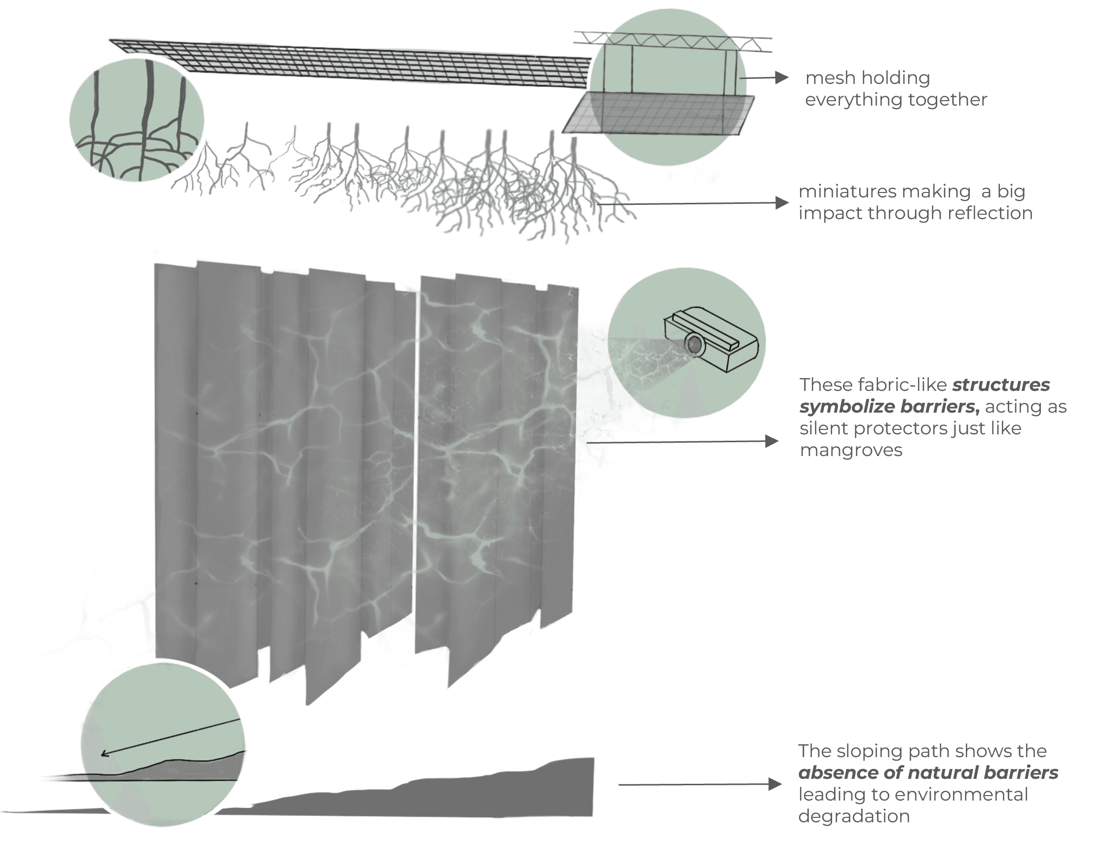As you walk through the shifting depths, once-lush roots gradually give way to barren soil, showing the slow, relentless decay of these vital barriers. This spatial experience is more than just a journey—it’s a reflection on the fragility of nature and a compelling call to action.